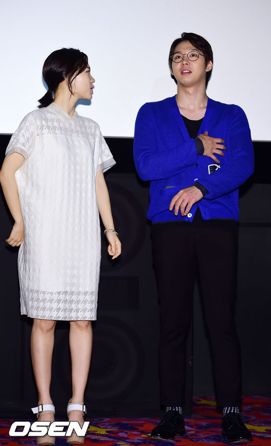 19일 오후 서울 동대문 메가박스에서 열린 영화 '해무' 무대인사행사, 박유천이 한예리와 얘기를 나누고 있다.