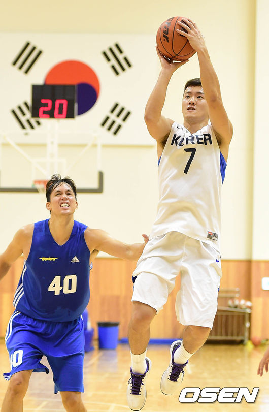 19일 오후 충북 진천군 진천선수촌에서 열린 남자농구대표팀과 서울 삼성의 경기, 박찬희가 슛을 시도하고 있다.
