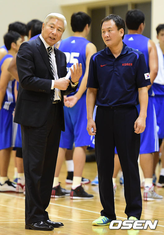 19일 오후 충북 진천군 진천선수촌에서 열린 남자농구대표팀과 서울 삼성의 경기 종료 후 방열 대한농구협회장과 유재학 대표팀 감독이 이야기를 나누고 있다.