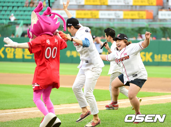 19일 오후 인천 문학야구장에서 열린 '2014 한국야쿠르트 세븐 프로야구' SK 와이번스와 두산 베어스의 경기, 경기에 앞서 개그맨 황영진, 홍윤화가 시구, 시타를 위해 마운드에 오르고 있다.