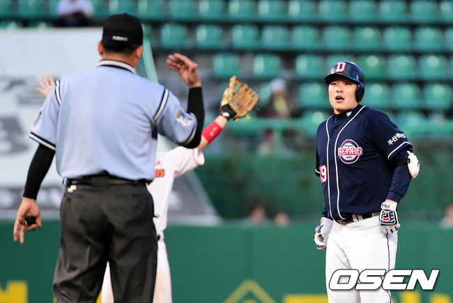 19일 오후 인천 문학야구장에서 열린 '2014 한국야쿠르트 세븐 프로야구' SK 와이번스와 두산 베어스의 경기, 2회초 2사 만루에서 두산 민병헌이 타구가 파울로 선언되며 아쉬워하고 있다.