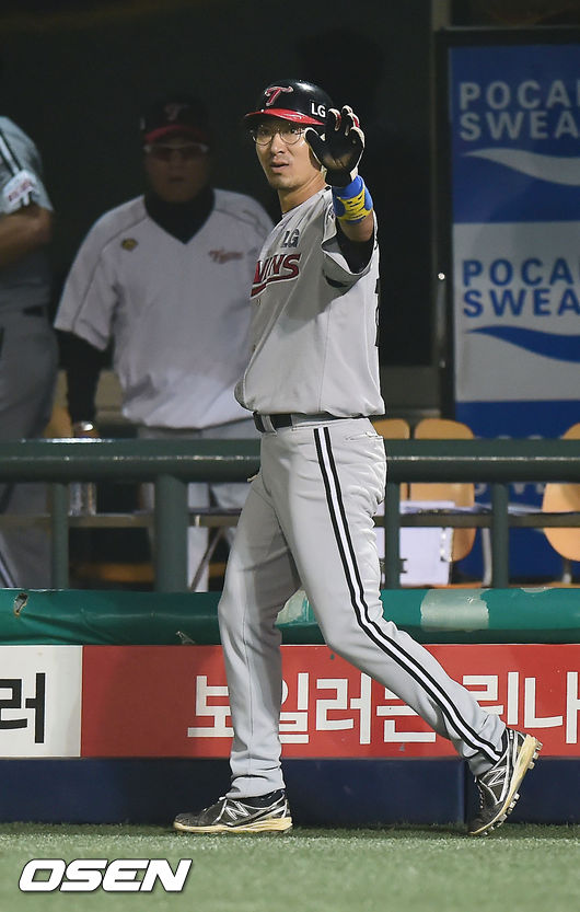 19일 오후 서울 목동 야구장에서 열린 '2014 한국야쿠르트 세븐 프로야구' 넥센 히어로즈와 LG 트윈스의 경기, 5회초 1사 주자 1루 LG 박경수의 좌익수 오른쪽 동점 1타점 적시타때 홈을 밟은 정성훈이 덕아웃에서 기쁨을 나누고 있다.