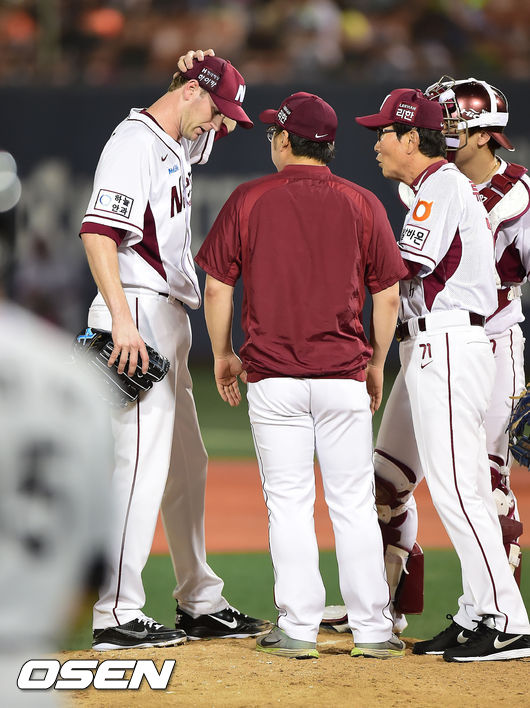 19일 오후 서울 목동 야구장에서 열린 '2014 한국야쿠르트 세븐 프로야구' 넥센 히어로즈와 LG 트윈스의 경기, 6회초 1사 주자 2루 LG 최경철 타석에서 넥센 선발 밴헤켄이 류영수 투수코치와 얘기를 나누고 있다.