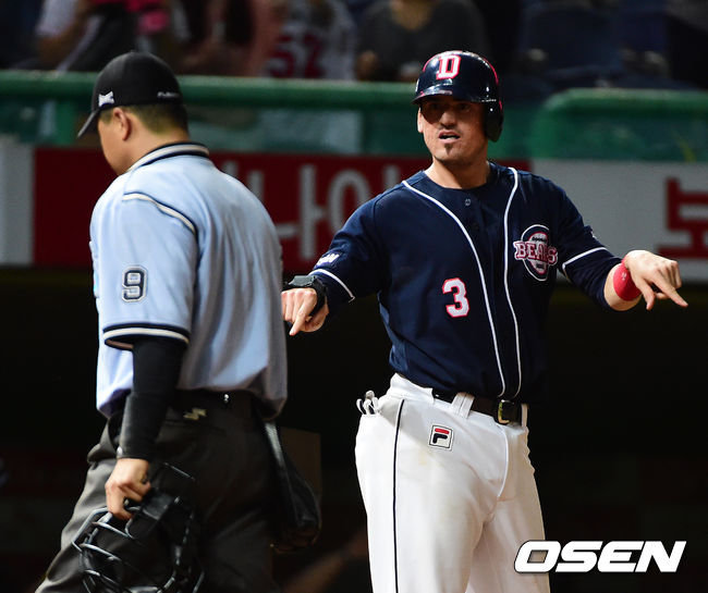 19일 오후 인천 문학야구장에서 열린 '2014 한국야쿠르트 세븐 프로야구' SK 와이번스와 두산 베어스의 경기, 7회초 1사 3루에서 두산 칸투가 양의지의 중견수 플라이에 태그업, 구심의 아웃판정에 합의판정을 요구하고 있다. 결과는 아웃.