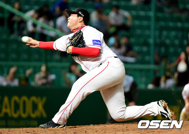 19일 오후 인천 문학야구장에서 열린 '2014 한국야쿠르트 세븐 프로야구' SK 와이번스와 두산 베어스의 경기, 9회초 SK 박민호가 역투하고 있다.