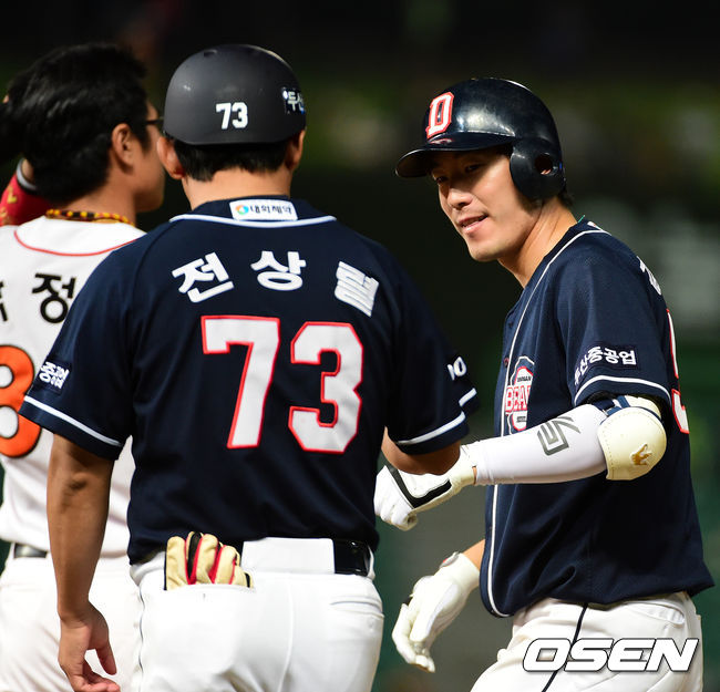 19일 오후 인천 문학야구장에서 열린 '2014 한국야쿠르트 세븐 프로야구' SK 와이번스와 두산 베어스의 경기, 9회초 2사 1,3루에서 두산 김재호가 1타점 적시타를 날리고 전상렬 코치와 주먹을 맞대고 있다.