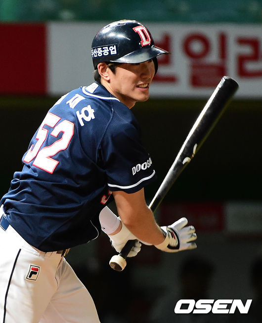 19일 오후 인천 문학야구장에서 열린 '2014 한국야쿠르트 세븐 프로야구' SK 와이번스와 두산 베어스의 경기, 9회초 2사 1,3루에서 두산 김재호가 1타점 적시타를 날리며 타구를 바라보고 있다.