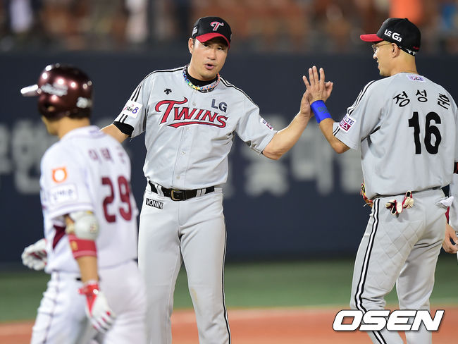 경기를 마치고 LG 봉중근이 정성훈과 하이파이브를 하고 있다./ rumi@osen.co.kr