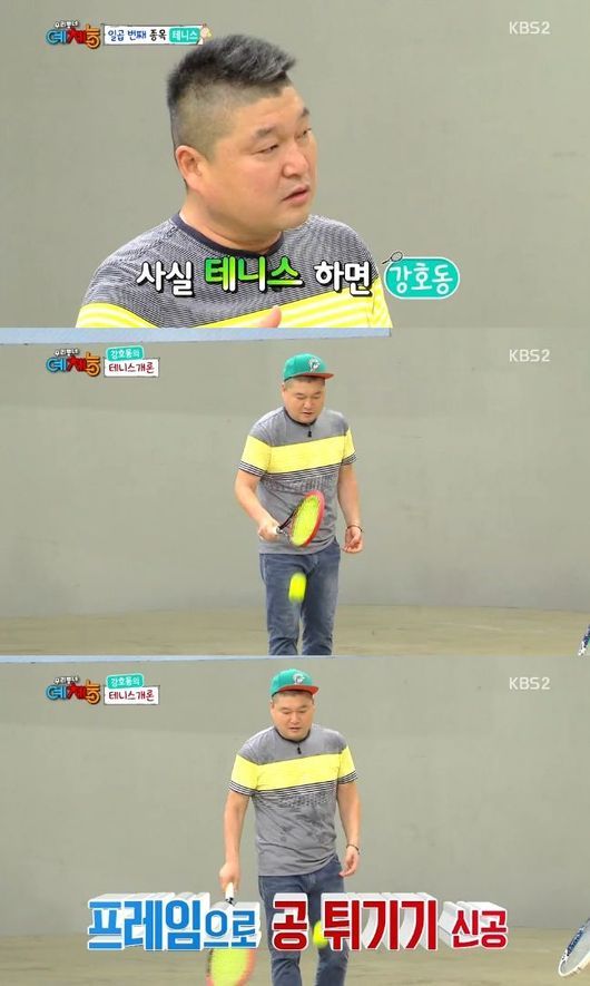 강호동은 19일 오후 11시 15분 방송된 KBS 2TV '우리동네 예체능'에서 수준급의 테니스 실력을 뽐냈다.