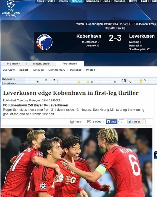 유럽축구연맹(UEFA)은 홈페이지에 레버쿠젠과 코펜하겐의 경기를 자세하게 설명했다. 특히 경기 결과에 대해 리뷰를 하며 손흥민에 대해 언급했다.