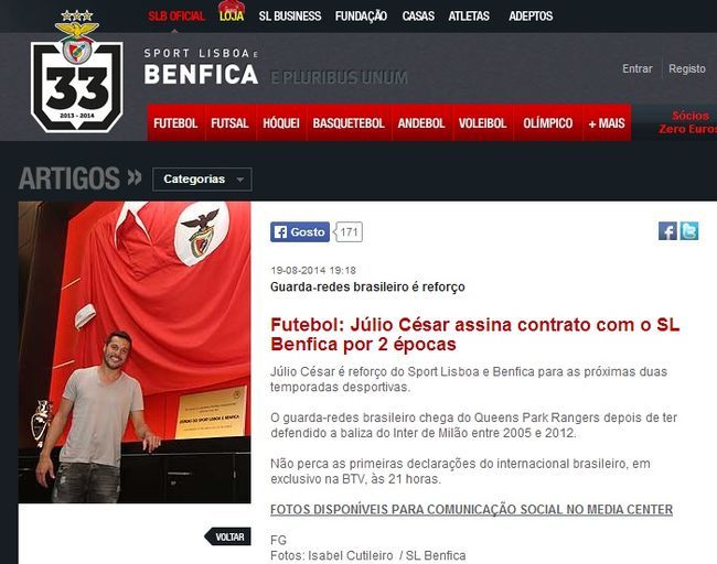 벤피카는 20일(이하 한국시간) 공식 홈페이지를 통해 세사르와 2년 계약을 맺었다고 발표했다. 퀸스파크 레인저스(QPR)에서 부상과 주급 문제로 주전에서 밀려난 세사르는 미국 메이저리그사커(MLS) 토론토FC를 거치며 QPR과 계약을 해지했고, 자유계약선수로 벤피카의 유니폼을 입게 됐다.