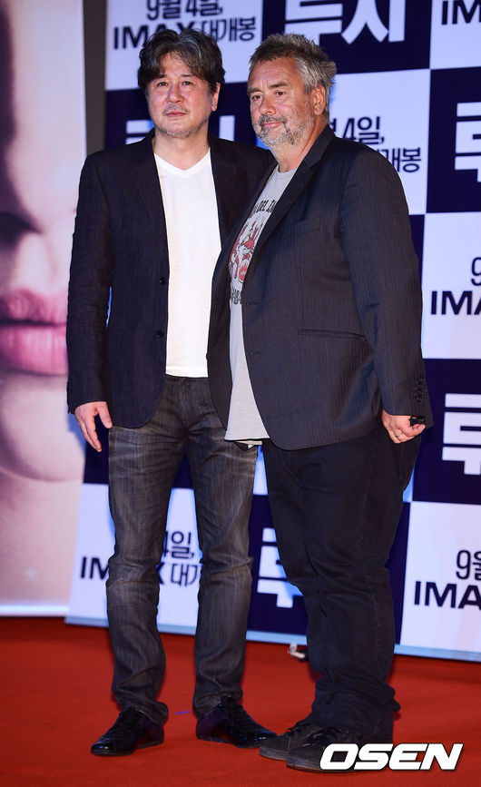 20일 오후 서울 용산 CGV에서 열린 영화 '루시'(원제: LUCY 감독 뤽 베송) 언론시사회에서 뤽 베송 감독과 최민식이 포즈를 취하고 있다.