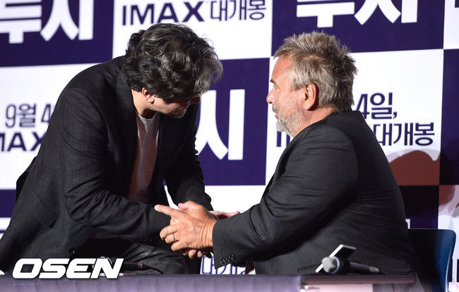 20일 오후 서울 용산 CGV에서 열린 영화 '루시'(원제: LUCY 감독 뤽 베송) 언론시사회에서 뤽 베송 감독과 최민식이 악수를 나누고 있다
