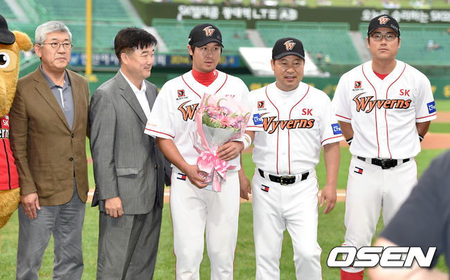 경기에 앞서 SK 최정의 통산 1000안타 기념 KBO 및 구단의 시상식에서 유남호 KBO위원, 민경삼 SK 단장, 최정, 이만수 감독, 박정권이 함께 기념촬영을 하고 있다.