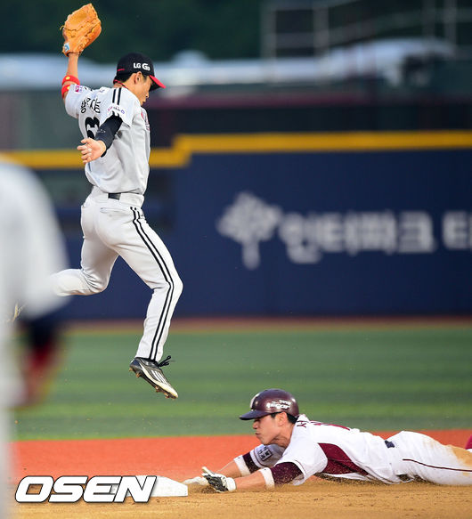 20일 오후 서울 목동구장에서 열린 2014 한국야쿠르트 세븐 프로야구 넥센 히어로즈와 LG 트윈스의 경기, 1회말 무사 1루 넥센 이택근 타석때 1루 주자 서건창이 도루 성공하고 있다
