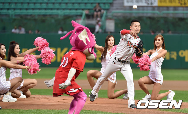 경기에 앞서 SK 응원단장 정영석이 승리기원 시구를 하고 있다.