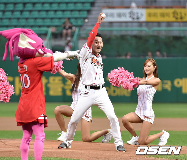 경기에 앞서 SK 응원단장 정영석이 승리기원 시구를 하고 있다.