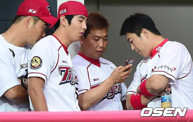 경기 취소 여부를 선수들이 기다리는 가운데, 김상훈이 덕아웃에서 동료들과 스마트폰을 바라보고 있다.