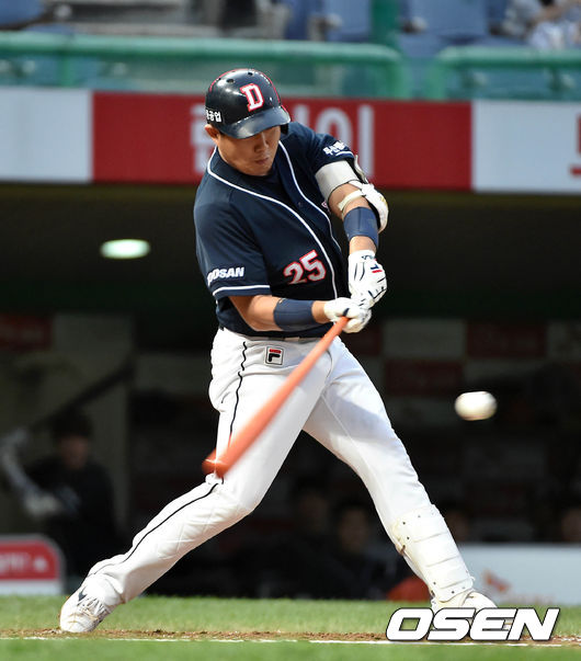 2회초 무사 1,2루에서 두산 양의지가 중전 적시타를 치고 있다.