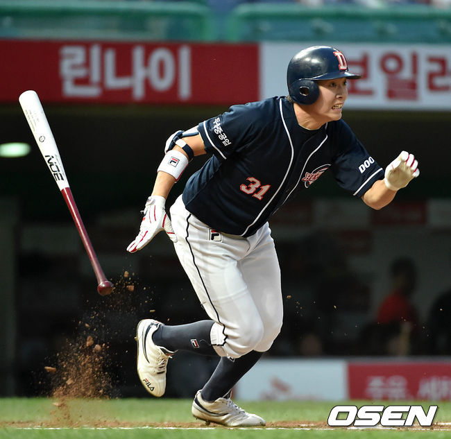 2회초 1사 만루에서 두산 정수빈이 내야땅볼로 출루하고 있다.