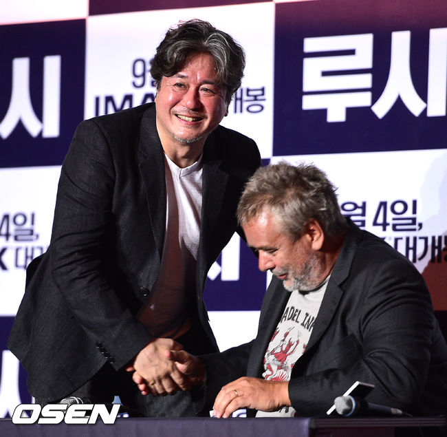 20일 오후 서울 용산 CGV에서 열린 영화 '루시'(원제: LUCY 감독 뤽 베송) 언론시사회에서 최민식이 뤽 베송이 악수를 나누고 있다