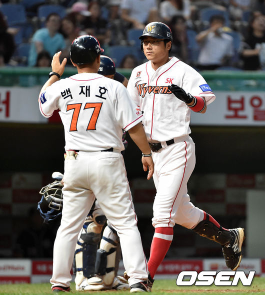 2회말 2사에서 SK 박정권이 좌월 솔로 홈런을 치고 홈에서 백재호 코치와 하이파이브를 하고 있다.