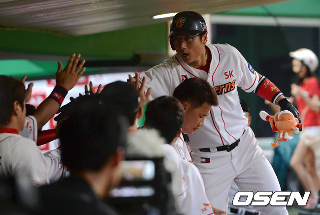 2회말 2사에서 SK 박정권이 좌월 솔로 홈런을 치고 더그아웃에서 동료들과 하이파이브를 하고 있다.