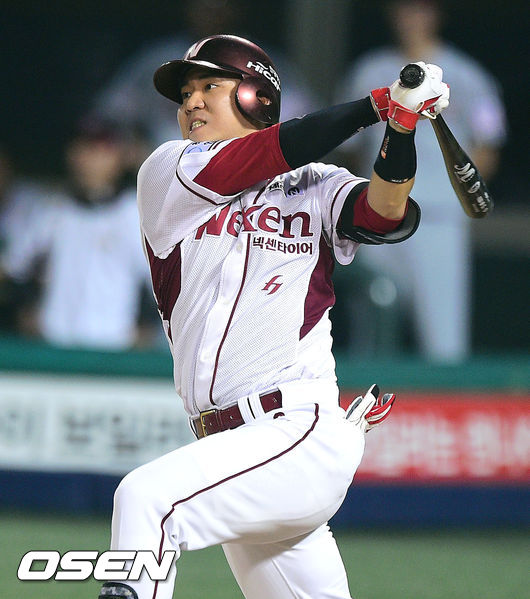 20일 오후 서울 목동구장에서 열린 2014 한국야쿠르트 세븐 프로야구 넥센 히어로즈와 LG 트윈스의 경기, 3회말 2사 1,2루 넥센 김민성이 1타점 적시타를 날리고 있다.
