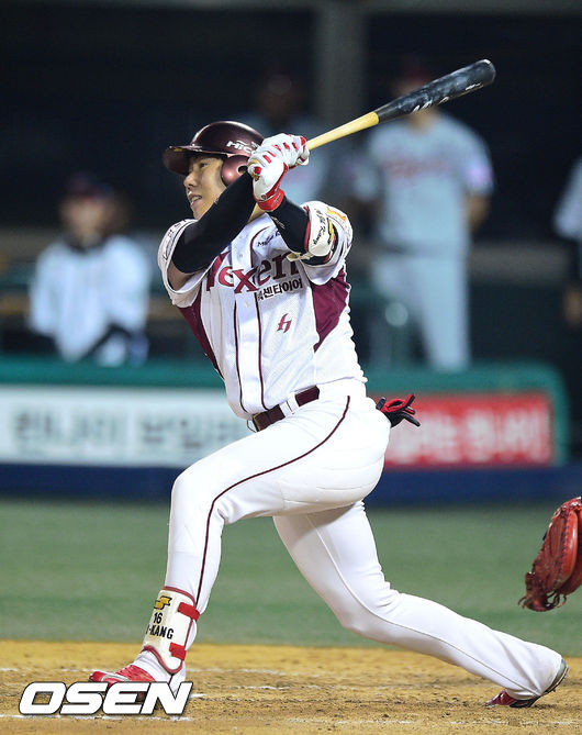 20일 오후 서울 목동구장에서 열린 2014 한국야쿠르트 세븐 프로야구 넥센 히어로즈와 LG 트윈스의 경기, 3회말 2사 1,3루 넥센 강정호가 1타점 적시타를 날리고 있다