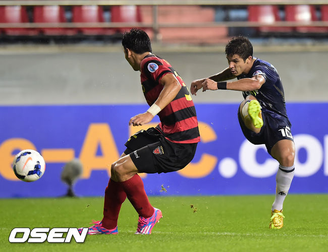 20일 오후 포항 스틸야드에서 열린 2014 ACL 8강 1차전 포항 스틸러스와 FC 서울의 경기, 전반 서울 에벨톤이 강슛을 날리고 있다.