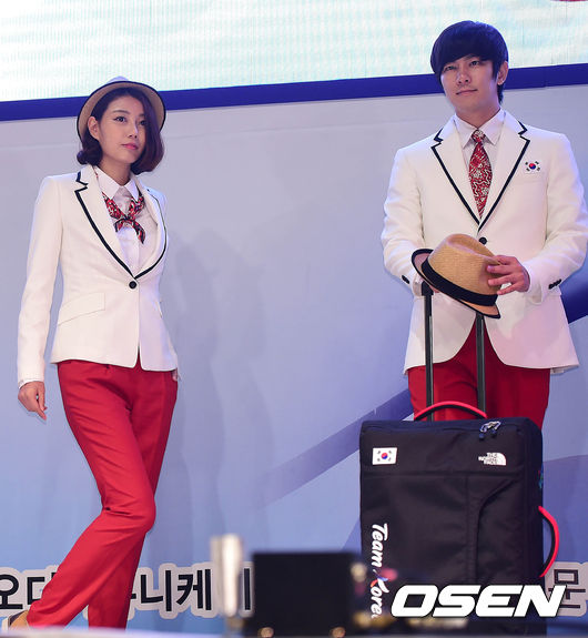 모델들이 인천아시안게임 공식 단복을 입고 워킹을 선보이고 있다.