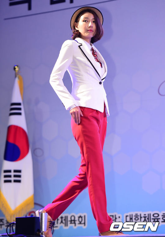 모델이 인천아시안게임 공식 단복을 입고 워킹을 선보이고 있다.