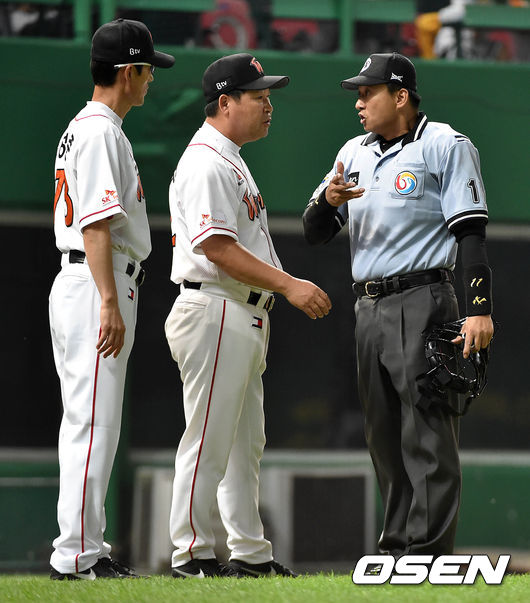 3회초 2사 만루에서 박종철 구심이 SK 채병룡의 연습투구 요청을 거절하자 그라운드로 나온 이만수 감독이 이 상황에 대해 어필하고 있다.