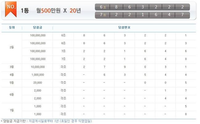 2등은 각 1등의 맨 끝자리 앞뒤 번호 4명으로 당첨금은 1억원씩이다. 3등은 각조 279031번이며 1000만원의 당첨금이 주어진다.