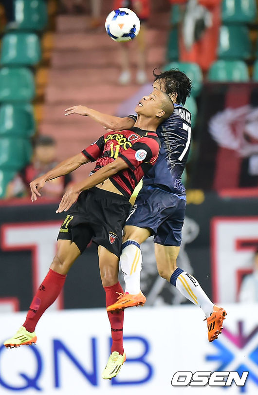 20일 오후 포항 스틸야드에서 열린 2014 ACL 8강 1차전 포항 스틸러스와 FC 서울의 경기, 서울 김치우와 포항 강수일이 공중볼 다툼을 하고 있다.