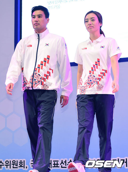 모델들이 인천아시안게임 공식 시상복을 입고 워킹을 선보이고 있다.