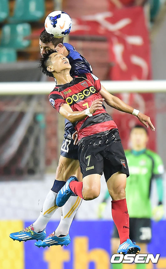 20일 오후 포항 스틸야드에서 열린 2014 ACL 8강 1차전 포항 스틸러스와 FC 서울의 경기, 전반 포항 김재성과 서울 오스마르가 공중볼 다툼을 하고 있다.