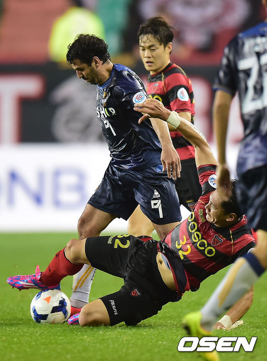 20일 오후 포항 스틸야드에서 열린 2014 ACL 8강 1차전 포항 스틸러스와 FC 서울의 경기, 서울 에스쿠데로가 돌파를 시도할때 포항 김형일에게 태클을 당하고 있다..