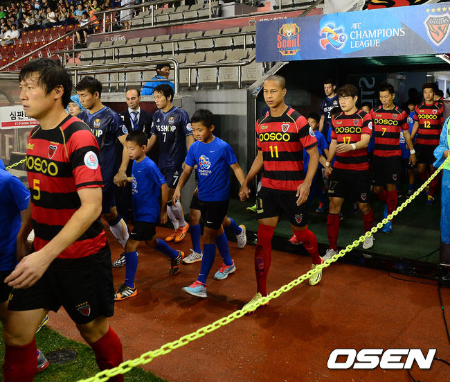 20일 오후 포항 스틸야드에서 열린 2014 ACL 8강 1차전 포항 스틸러스와 FC 서울의 경기, 경기 전 양팀 선수들이 그라운드로 나오고 있다.