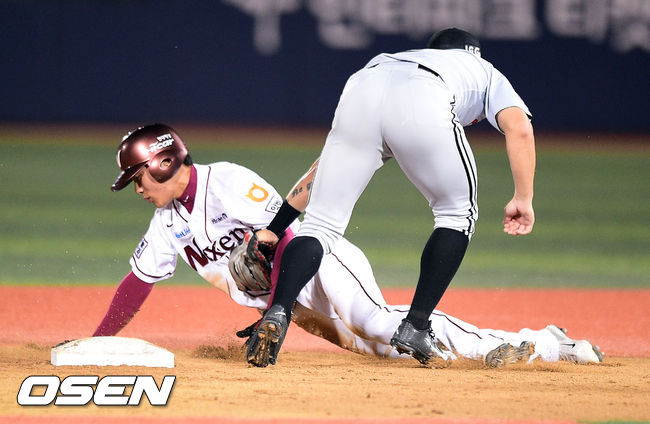 20일 오후 서울 목동구장에서 열린 2014 한국야쿠르트 세븐 프로야구 넥센 히어로즈와 LG 트윈스의 경기,8회말 2사 1루 넥센 박헌도의 타석때 도루 시도한 1루 주자 김하성이 태그아웃되고 있다