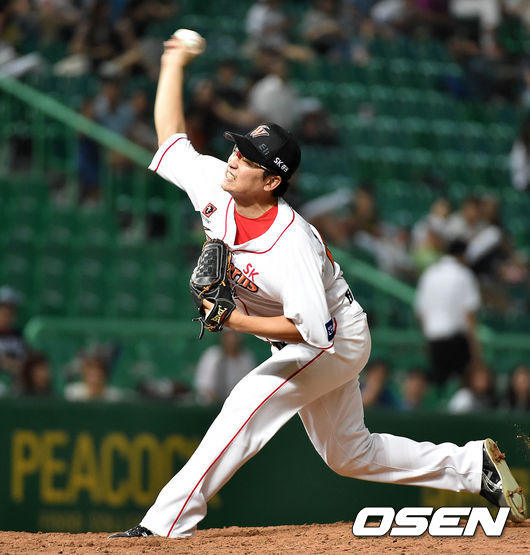 8회초 무사에서 SK 전유수가 힘차게 공을 던지고 있다.