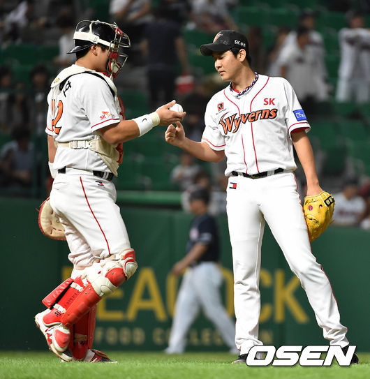 경기 종료 후 SK 정상호와 윤길현이 승리의 기쁨을 나누고 있다. /sunday@osen.co.kr