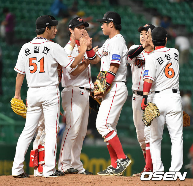경기 종료 후 SK 선수들이 승리의 기쁨을 나누고 있다. /sunday@osen.co.kr