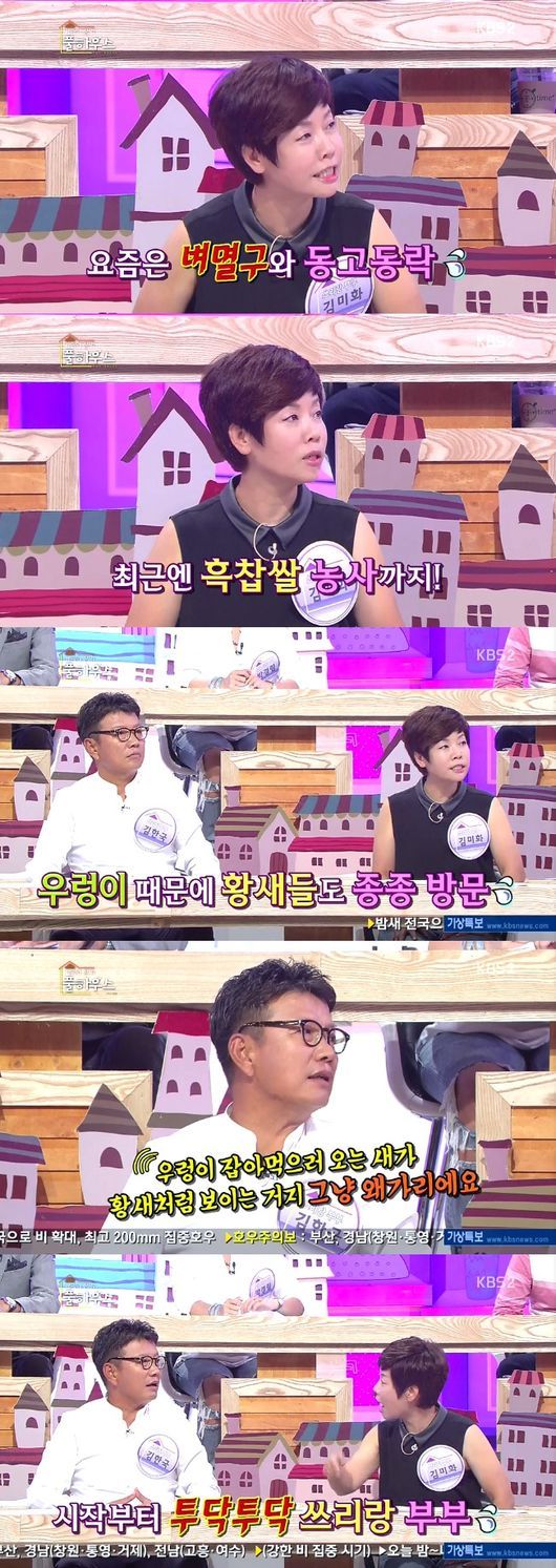 이어 "우렁이 때문에 황새들도 종종 방문한다"는 김미화의 말에 김한국은 "우렁이 잡아먹으러 오는 새가 황새처럼 보이는 거지 그냥 왜가리다"라며 반박해 여전히 투닥거리는 쓰리랑 부부의 모습으로 웃음을 자아냈다.