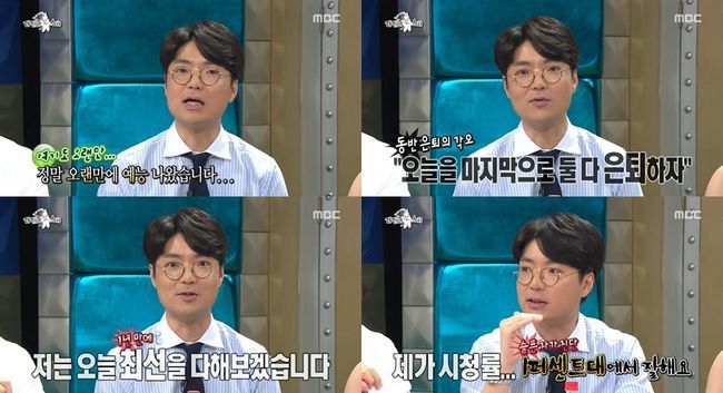 그는 이날 "정말 오랜만에 예능에 나왔다. 친분 있는 '라스' 작가가 나를 추천했다고 들었는데 오늘을 마지막으로 둘 다 은퇴하자고 했다. 오늘 최선을 다해보겠다"라고 각오를 다졌다.
