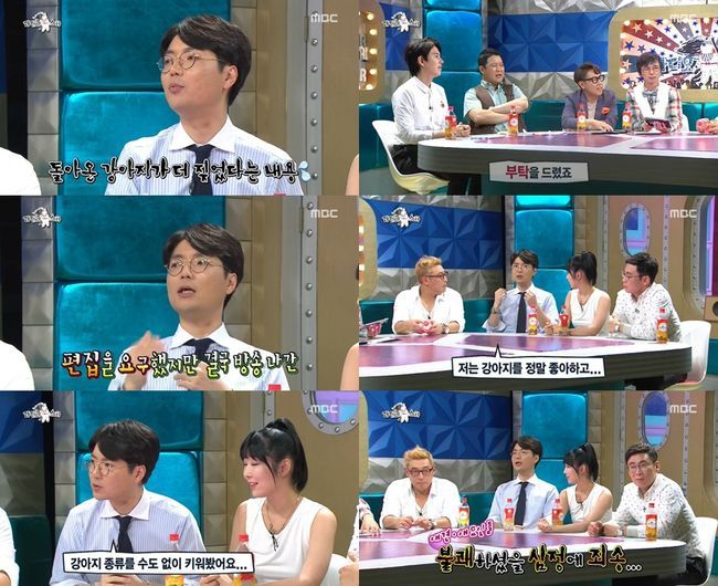 그는 이날 예능 부담감에 이야기를 지어낸 적이 있다고 말하며 "라디오에서 복수에 관한 주제였는데 사람은 안 될 것 같아서 강아지를 건드렸다. 강아지 CF에 착안해서 집 앞에 짖는 강아지를 한강에 버렸는데 다시 돌아왔다는 이야기였다"고 말했다.