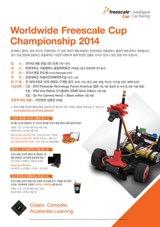‘프리스케일 컵(Freescale Cup)’ 대회는 프리스케일 대학지원 프로그램의 일환으로 지난 12년 간 전 세계 각국 대학 및 대학원생을 대상으로 진행 됐다. 올해는 한국, 미국, 중국, 일본, 유럽, 멕시코, 브라질, 대만, 말레이시아 등 총 9개국에서 치열한 경쟁을 통해 각 국 우승자들을 선정했고, 최종적으로 15개 대학교의 17개 팀, 100여명의 각국 우승자들이 한국에 모여 전 세계에서 가장 똑똑한 인텔리전트 카(Intelligent car, 지능형 모형차)’를 선발하게 된다.