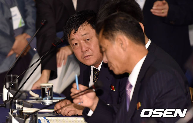 남자 체조 조추첨때 북한 올림픽위원회 대표단이 이야기를 나누고 있다.