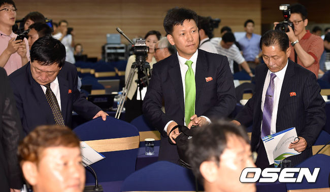 조추첨을 마친 북한 올림픽위원회 대표단이 행사장을 나가고 있다.
