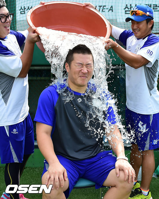 21일 오후 대구 시민구장에서 삼성 라이온즈와 두산 베어스의 경기가 열릴 예정인 가운데 삼성 최형우가 그라운드 위에서 아이스버킷챌린지를 하고 있다.
